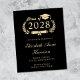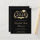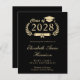 Modern prisvärd svart högskoleexamen inbjudan med "Class of" i en illustration av en gul lagerkrans som innehåller en examenshatt och ett diplom och examenens namn i ett elegant ljust guldskript. Lägg till deras skola, huvudämne, utmärkelser eller framtida planer.
