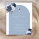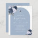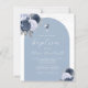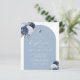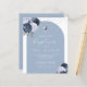 Denna eleganta dopinbjudan har en dammig blå valvform på vit bakgrund, flankerad i två hörn av ett par dammiga blå och marinblå blomsterbuketter med silvergrönska. En tredje, mindre bukett visas på ett silverfärgat falskt foliekors, ovanför orden "vänligen gå med oss till dopet av vår son" i elegant vit handskriven kalligrafi och kursiv stil. Personifiera den med namnet i vit script och detaljerna i sans serif-teckensnitt. En strödd silverfärgad falsk konfetti dekorerar den övre kanten av kortet. Baksidan är enfärgat dammig blå.