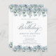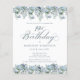 Dammiga blå blommor skapar övre och nedre ramar på denna eleganta födelsedagsinbjudan. Klassisk script kalligrafi lägger till en vacker touch. Denna artikel är en del av den dammiga blå blomstergestaltningen samling.