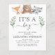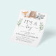 Budgeta Woodland Animals - Bear, Racoon, Fox Eucalyptus Grey Botanical Watercolor Vår Gender Neutral Det är en pojkbabyinbjudan på vit bakgrund - innehåller vacker och elegant manustypografi med moderna botaniska löv och grön för att speciella Mor ska vara firande.