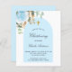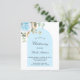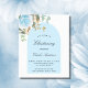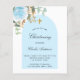 En vit bakgrund dekorerad med eukalyptusgrönska, en ljusblå ros, och gyllene blad och en blå bågram. Personifiera och barnets namn och ceremonidetaljer. Elegant handskriven stilsnurr. Baksida: ljusblå bakgrund.