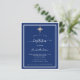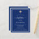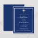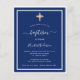 En modern, elegant inbjudan. En marinblå bakgrund dekorerad med vita ramar och ett gyllene kors. Personifiera och lägg till namn och detaljer. Vit text.