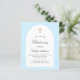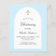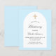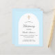 En ljusblå bakgrund och en vit valvram. Personifiera med namn och dopdetaljer. Elegant handskriven stilsnack.