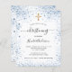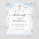 En modern, elegant dop, dop, firande en baby pojke. Vit bakgrund dekorerad med blå falskt glitterdamm och ett gyllene kors. Anpassa och lägg till ett namn och festdetaljer. Svarta bokstäver.