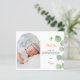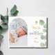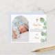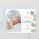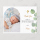 En modern och elegant dopkort tack. En chic vit bakgrund dekorerad med eukalyptusgrönska. Anpassa och lägg till ditt foto av barnet, tackmeddelande och namn. Foto båge ram.