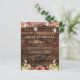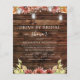 Budget lantlig landsbygd utomhus på mörkt trä med vinröda, orange och gula solrosor i murskår i strängljus höst eller höst bröllop kör igenom bröllops shower inbjudan - inkluderar vacker och elegant script typografi för den speciella brud att vara firande.
