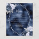 Den moderna bröllop-menyn i elegant har en silver-geometrisk ram som är dekorerad med dammiga blåa, marinblå och silver-blommigt buketter på en marin blå folie. I anpassadet kombineras silver grått med fysisk handskrift, tryckplåt och kursivt typsnitt.