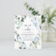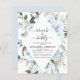 Budgeten Dusty Blue Blommigt Ro och Eucalyptus Botanical Grey Watercolor Vår eller Summer Bröllop Brunch och BubLY Champagne Inbjudningskort för möhippa - innehåller vackra och elegant manustypografi med moderna tropiska botaniska blommor och grönenergi för speciella Briden i firande.