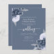 This elegant wedding invitation features dusty blue floral bouquets set off with silver faux foil greenery in two corners, on a dusty blue background. The customizable text combines silver gray serif, italic and handwriting fonts. The reverse side provides space for wedding details, along with a QR code guests can scan to visit your website and RSVP.