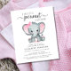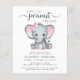 En söt och budgetvänlig duschinbjudan till flicka med "En söt liten jordnöt är på väg" skriven i en blandning av mjuk grått, modern typografi och snyggt, och en pastellfärgad rosa av en elefant från flicka. Anpassa mor namn och duscha detaljer i enkel grått typografi.