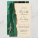 The left-hand edge of this elegant modern wedding invitation features an emerald green watercolor agate border trimmed with faux gold glitter. The customizable text combines green handwriting, copperplate and italic fonts on a champagne beige background. The reverse side features a matching emerald green and gold agate design.