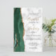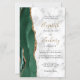 The left-hand edge of this elegant modern wedding invitation features an emerald green watercolor agate border trimmed with faux gold glitter. The customizable text combines gold-colored handwriting script with black copperplate and italic fonts on a gray and white marble background. The reverse side features a matching emerald green and gold agate design.