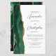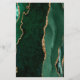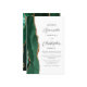 The left-hand edge of this elegant modern wedding invitation features an emerald green watercolor agate border trimmed with faux gold glitter. The customizable text combines charcoal gray script and sans serif fonts on a white background. A matching emerald green agate design appears on the back of the card.