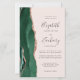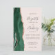 The left-hand edge of this elegant modern wedding invitation features an emerald green watercolor agate border trimmed with faux rose gold glitter. The customizable text combines charcoal gray handwriting, copperplate and italic fonts on a blush pink background. The reverse side features a matching emerald green and rose gold agate design.