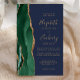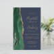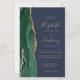 Den här elegantens lämnat kant har en modern bröllopsinbjudan och en framväxande grönt vattenfärgsagat gräns trimmad med faux guld glitter. Anpassadet kombinerar handskrift, rityta och kursivt typsnitt med guld-färgad på en marin blå bakgrund. Den omvända sidan har en matchande framväxande grönt och guld agate-design.