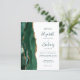 Den här elegantens lämnat kant har en modern bröllopsinbjudan och en framväxande grönt vattenfärgsagat gräns trimmad med faux guld glitter. I anpassadet kombineras visuella handskriftsskript, mönsterskylt och kursivt typsnitt i grönt i emerald på vit bakgrund. Den omvända sidan ger plats för bröllop-information på en solid vit bakgrund, tillsammans med en QR-kodgäst som kan söka igenom webbplatsen och OSAN.