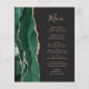 Den moderna bröllop-menyn på den lämnat kant i eleganten har en framväxande grönt vattenfärgsagat gräns som trimmas med faux ro guld glitter. Anpassadet kombinerar grått-handskriftsskript och typsnitt på mörkens bakgrund. Den omvända sidan har en matchande framväxande grönt och ro guld agate-design.