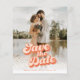 Ett bröllop spara datum med en anpassningsbar foto och persikofärgad färgad stil-typografi är ett unikt och snyggt sätt att meddela dina kommande barn till dina vänner och familj. Anpassningsbarnas foto är en speciell beröring som lägger till ett personligt och sentimentalt inslag till designen, medan teckensnittet persiko vintage stil lägger till ett pekfinger av retro och stollig. Den här designen är säker på att imponera och få alla att bli upphetsade för din stora dag.