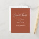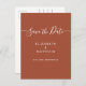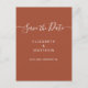 Budget minimalist enkel skript icke-foto bröllop sparad datum tillkännagivande personlig prisvärd låg budget vykort i bränd orange jordnära terrakotta rost boho öken. Enkel ren designmall med elegant kursiv handstil typografi skript "Spara datum" text. Detta klassiska kort perfekt för ett par som vill ha ett traditionellt sparat datum med en modern touch, utan foto. Om du behöver hjälp eller matchande artiklar, vänligen kontakta formgivaren.