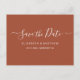 Budget minimalist enkel manus bröllop spara datum icke-foto meddelande personlig prisvärd låg budget vykort i jordnära terrakotta boho öken rost bränd orange. Rent enkelt designmall med elegant kursiv handskriven typsnitt/ kalligrafi manus "Spara datum" text. Detta klassiska kort är perfekt för ett par som vill ha ett traditionellt "spara datum" med en modern touch, utan foto. Om du behöver hjälp eller matchande föremål, vänligen kontakta formgivaren.