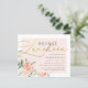 Modern bröllops-lunch bröllopsfest inbjudan med falskt guld folie skrift mot en rosafärgad överlägg med vackra akvarell peonior och rosor i nyanser av persika och kräm i ett hörn. Dina detaljer visas med en enkel, stilren typografi. Som en del av det budgetalternativ som finns här på Zazzle, kommer dessa inbjudningar inte med kuvert och passar inte heller tätt i ett standardstorlekskuvert. Den närmaste storleken är A6, men det kommer att finnas ett mellanrum på ungefär en halv tum. Om du inte har något emot att det inte passar tätt kan du använda sådana lättillgängliga A6-kuvert. Annars kan denna design överföras till ett standardformat 5x7 (som kommer med kuvert) med hjälp av designöverföringsverktyget. Som en grov guide, vid tidpunkten för skrivandet, skulle 100 budgetinbjudningar (inklusive volymrabatt) kosta runt $39 medan 100 standard 5x7 inbjud