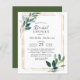 Denna moderna budgeteuqualiptus Inbjudningskort för möhippan - har geometrisk gyllene ram med blomstrande Eucaliptus-snokar och grenar, modernt skript. Den omvända sidan av inbjudan till möhippa är oliv grönt mörk.