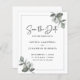 Budgeterad minimalistisk Grönt av kalligrafi, Eucalyptus Bröllop spara datum... Vårt botaniska Spara datumkortet innehåller en grönt ram med trendig dammig grönt eukalyptus grenar som skapar en elegant gräns för inbjudningstexten i. Kortets baksida innehåller webbplatsinformation för bröllop och en grafikmall för QR-kod som du kan ersätta med en egen (eller ta bort). All exempeltext på båda sidor av kortet (förutom textbilden Spara datum) kan enkelt revideras med egna uppgifter om anpassningsmallen.
