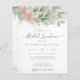 Vackrik luncheon-inbjudan till möhippa med rosa blommigt-vattenfärgen eukalyptus och guld löv.