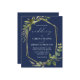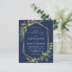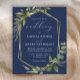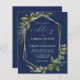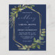 Den här eleganten är en inbjudan till ett rostiskt bröllop med en guld-faux-folie med geometrisk ram som dekoreras med eukalyptus och olivgreer på marin blå bakgrund. Ord "bröllop" visas i kalligrafiskt skript. Anpassa den vita texten med namn på briden och trippen och bröllop-informationen på framsidan, och deras initialer och webbplats-URL på baksidan.