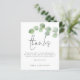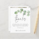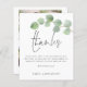 BUDGET Eucalyptus Script Quote Bröllop 3 Foto Tack. Ett budgetpris MINDRE 4,5” x 5,6” alternativ. Finns i en SEMI GLOSS 110 lb KORTKVALITET som är standardalternativet (rekommenderas för inbjudningar), ELLER en SATIN FINISH 80 lb TUNNARE PAPPERSKVALITET (ideal för inklusioner). Kuvert är ett tillval och är något större än kortets storlek. Tack är i en elegant handstilsstil med script och en elegant gren av gröna eucalyptusblad ovanför. Resten av texten kan du enkelt anpassa. På baksidan ersätter du provfotona med dina tre favoriter från din speciella dag. Du kan också ändra teckensnittsstilar och färger, samt bakgrundsfärger på framsidan och baksidan