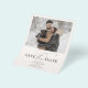 Lägg märke till din speciella dag utan att spräcka din budget med vårt dyra bröllop spara datum-kort! Med det valda fotot på framsidan fångar det här kortet på ett vackert sätt din glädje och upphetsning. Under bilden kombinerar "Spara datum" elegant serif-teckensnitt med finare-delikat skript, vilket ger ett meddelande om snyggt. Ditt namn och datumet visas på en framträdande plats, så att gästerna kan markera sina kalendrar. Ta med ett foto och mer information om det kommande bröllop. Perfekt för par som vill ha lite elegans på en överkomlig pris!