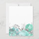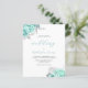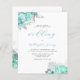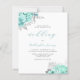 This elegant wedding invitation features aqua floral bouquets trimmed with silver foliage. The word "wedding" and the couple's first names appear in beautiful calligraphy aqua script, with the remaining text in charcoal gray sans serif on a white background. A larger, coordinating aqua and silver floral design appears on the back.