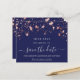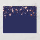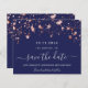 En trendig Spara datumet för en 40-års (eller vilken ålder som helst) födelsedagsfest. En marinblå bakgrund med roséguld stjärnor. Texten: Spara datumet är skriven med en stor trendig handskriven stil. Ljusgrå färgade bokstäver.