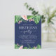 Budget Gröna Tropiska Palmer, Marinblå Bakgrund och Rosafärgade Blommor Vattenfärg Födelsedagsfest Inbjudningar inkluderar vacker och elegant skript typografi med moderna botaniska rosafärgade blommor och tropisk hawaiiansk grönska för den speciella 16:e, 18:e, 21:a, 30:e, 40:e, 50:e, 60:e, 70:e födelsedagsfirandet.
