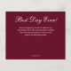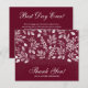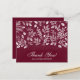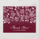 Det här burgundiska platta tackkortet är ett utmärkt värde som är tryckt på 110 lb pappert och har ett vitt löv mönster, ord "Tack" och ditt namn i chic, vit text på framsidan och ditt personliga budskap på baksidan. Perfekt tackkort för bröllop, möhippa, babydusch, födelsedag, årsdag, studenten eller speciella evenemang. VITE-kuvert är valfritt. Mått 4,5 x 5,6 tum, men du kan välja mellan tre pappra storlekar. MER FÄRG i vår samling.