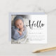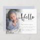 Budget Foto Hello Boy Blue Födelseannons. Ett budgetpris MINDRE 4,5” x 5,6” alternativ. Finns i ett SEMI GLOSS 110 lb KORTKORTS PAPPER som är standardalternativet (rekommenderas för inbjudningar, liknande tjockleken på ett vykort), ELLER ett SATIN FINISH 80 lb TUNNARE PAPPER (idealisk för inklusioner). Skicka det glada budskapet om din nya baby pojke med denna minimalistiska fotoutformning, med ett vackert manus för Hello och resten av texten är lätt att anpassa. Byt ut provfotot med ditt eget. Ett gradientöverlägg är ovanpå ditt foto så att det bleknar bort när det når mitten med texten delvis överlagd ovanpå. Du kan ändra bakgrundsfärgen på baksidan via anpassa ytterligare