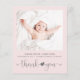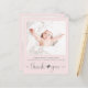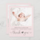 Ett budgetvänligt enkelt och sött tack-födelsemeddelande för en babyflicka med modern, mjuk grå typografi mot en pastellrosa bakgrund. Framsidan visar din babyflickas foto, namn, ankomst datum och födelseuppgifter, och "tack" skrivet i ett trendigt skrivstil med ett hjärta som binder samman de två orden. På baksidan läggs ett ytterligare foto till, och ett personligt tackmeddelande samt föräldrar och syskonnamn under en koordinerande söt pil med ett hjärta i mitten.