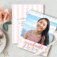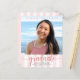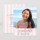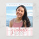 Var stolt, gläd dig och meddela världen att din favoritutexaminerade har nått sin milstolpe med denna fantastiska, enkla, moderna, personliga budgetmeddelandeinbjudan. Gnistrande, elegant, falsk rose gold-glitter kalligrafiskrift, grå sans serif-typografi och ett foto som du väljer överlagrar en ljus rosa och vit randig bakgrund. Anpassa den anpassade texten med din examen kandidat namn, skolnamn, klassår och examensdatum. På baksidan lägger du till din personliga anteckning, nästa skola de går på, festinformation osv. Garanterat att lägga till snygg kul till deras speciella tillfälle!