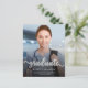 Modernt examensbevis med ett anpassat vertikalt foto. Ordet "graduate" visas i silverfärgad falsk folieskrift med lockiga dekorativa svansar i början och slutet. Lägg till examenens namn, skola och examensår nedan i vit sans serif-teckensnitt. Ersätt enkelt provbilden med ditt eget examensfoto. En svart gradientbakgrund hjälper till att få texten att sticka ut. Baksidan har ett silverfärgat falskt foliehorisontellt randmönster. Perfekt för både gymnasie- och högskoleexamen. OBS: Kuvert ingår inte automatiskt i dessa budgetinbjudningar, så glöm inte att välja alternativet "tomma vita kuvert"!