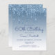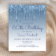 Trendigets 60-årsinbjudan har en glatt blå faux glitter drip gräns och blå ombre-bakgrund. Ord "60:e födelsedagen" och hedersgästens namn visas i handskriftsskript i avslappnad med resten av anpassadet i blått sans serif-teckensnitt. Samma blå glitter-droppdesign visas på baksidan.