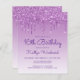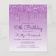 Denna trendiga 16-års inbjudan har en gnistrande lila glitterdrops-kant och en lila ombre-bakgrund. Orden "16-årsdag" och namnet på hedersgästen visas i en avslappnad lila handskriven stil, medan resten av den anpassningsbara texten visas i en sans serif-font. Samma lila glitterdrops-design visas på baksidan.