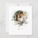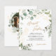 Design feature greenery eucalyptus watercolor with floral gold glitter elements. Using elegant calligraphy font in gold color for the name of the bride and groom that makes it stand-out. It also features couple photo at the back with elegant script monogram.