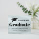 Denna design har en utskrift av gråfärgat glas i bakgrunden med en examensmössa.