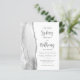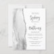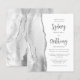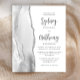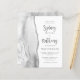 Den vänstra kanten på denna eleganta moderna bröllopsinbjudan har en grå och vit akvarell-agat-kant med falskt silverglitter. Den anpassningsbara texten kombinerar kolgrå kalligrafiskrift och sans serif-teckensnitt på vit bakgrund. Baksidan har en matchande grå, vit och silver agat-design.