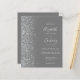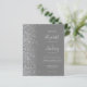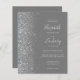 Den vänstra kanten på denna eleganta moderna bröllopsinbjudan har en silverfärgad falsk glitterkant. Den anpassningsbara texten kombinerar blek silvergrå handskrift, kopparstick och kursiva teckensnitt på en grå bakgrund. Baksidan ger utrymme för bröllopsdetaljer på en solid grå bakgrund, tillsammans med en QR-kod som gästerna kan skanna för att besöka er webbplats och svara.