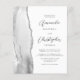 Den här elegantens lämnat kant har en modern bröllopsinbjudan med grått och vit vattenfärg som agerat i gräns med faux silver glitter. Anpassadet kombinerar grått-skriptet för kol och sans serif typsnitt på vit bakgrund. Den omvända sidan ger plats för bröllop-information på en solid vit bakgrund, tillsammans med en QR-kodgäst som kan söka på webbplatsen och OSAN, vilket sparar kostnaderna för utskrift och utskick av separat OSA kort.