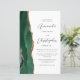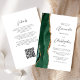 The left-hand edge of this elegant modern wedding invitation features an emerald green watercolor agate border trimmed with faux gold glitter. The customizable text combines charcoal gray script and sans serif fonts on a white background. The reverse side provides space for wedding details on a solid slate white background, along with a QR code guests can scan to visit your website and RSVP, which saves the cost of printing and mailing separate RSVP cards.