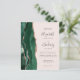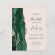 The left-hand edge of this elegant modern wedding invitation features an emerald green watercolor agate border trimmed with faux rose gold glitter. The customizable text combines charcoal gray handwriting, copperplate and italic fonts on a blush pink background. The reverse side provides spaces for 4 photos (1 square, 2 horizontal, 1 long vertical) and room for your wedding website URL or other information.