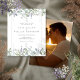 En inbjudan till ett söt budgetbröllop med söt sage och lilac löv som tumlar över en elegant silver ram som omger dina bröllop-detaljer som anges i klassisk elegant och ditt speciella foto på motsatt sida. Designad av Thisisnotme©