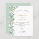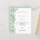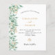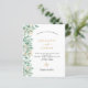 En chic vit bakgrund som dekorerats med grönt och faux botaniska sprickor i guld, blommigtar i grönt och lövning. Anpassa och lägg till information om namn och bröllop. Svart och guldfärgad färgad brev. Bakåt: gröntens bakgrund färg.